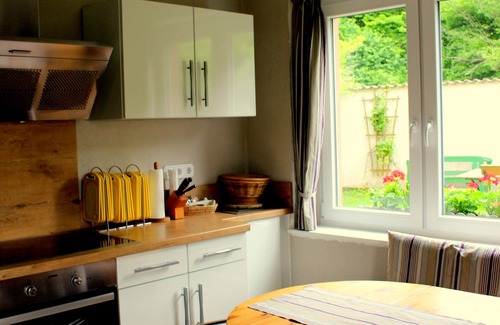 Our vacation home is situated in absolute isolation on a 10.000 m² spacious property, directly on the Kyll River, one of the most reknowned trout waters in Germany. It easily accomodates 12 to 14 adults, thereby suitable for clubs, hiking groups, short holidays with friends etc. Furnished with loving care, cosy and snug.