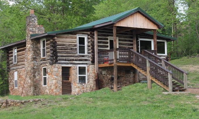 SLEEPS 7 with two bedrooms and one bathroom- Our authentic log cabin was built in the early 1930's and has been newly restored. It is situated on nearly 300 peaceful acres along the Meramec River and has river frontage for you to enjoy. We have easy river access and a small gravel bar. Float trips by canoe or raft may be available by reservation for an additional fee. Bedroom #1 has a queen size bed, antique dresser, and a fireplace. The bunkroom has one full bed, one twin bed, and a set of bunk beds. The back porch dining hall seats 12 people and has plenty of room for games and activities (we have several to choose from or bring your own). There is a TV, SmartTV, Netflix, and VCR/DVD player (we have some movies too)! The kitchen is stocked too! There is room to pitch a tent (or several for an additional fee)! Relax away from the stress in our quiet getaway and make many new memories. This place is the perfect place to get away from it all and 'rough it' while still enjoying the modern conveniences of home!