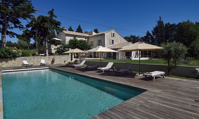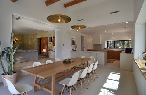 Skilful renovation of an authentic 500 m² Provencal farmhouse, combining dry stone and aluminium windows, waxed concrete and wood .... There's everything you need for a wonderful holiday in the sun: swimming pool, boules pitch, football pitch, etc.