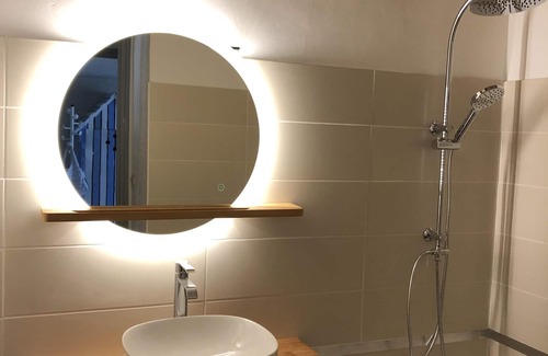 A bathroom and separate WC - an additional shower in the garage with small laundry area.