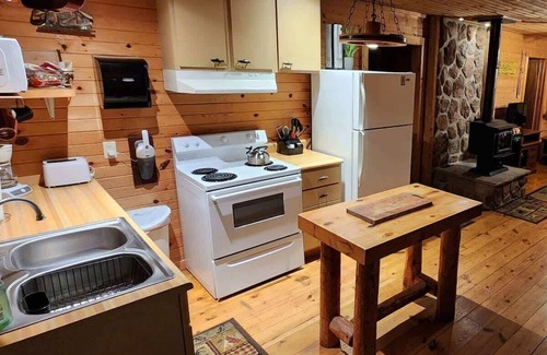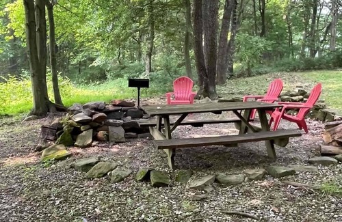 Rustic charm meets modern convenience in this secluded woodland retreat. Enjoy StarLink Business Class internet, an indoor wood-burning stove, and outdoor hot tub. Sleeps 6 with 2 private bedrooms, queen-size log futons, and a full bathroom. Family room features a 55” LED HDTV with Chromecast and Blu-Ray/DVD player. Central heating/cooling and fully equipped kitchen included. Privacy ensured with a location 70 yards from the nearest cabin and a private backyard fire pit, picnic table, and grill.
