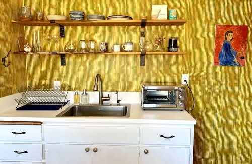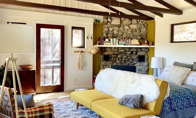 The open living plan contains a sofa and a queen bed and old stone fireplace (fires permitted Nov-May). The updated vintage bathroom has a deep claw-foot tub with a shower handle extension, there is no standing shower. The open kitchen is equipped with a Chemex pour-over coffee carafe, electric kettle, toaster oven, toaster, microwave, and mini-fridge. There are many lovely details in the cabin fostering an old California feel and slow pace. The back of the cabin extends out into a wide wild oak forest which is completely open and private to our guests. We embrace non-toxic cleaners, organic cotton bedding, organic body products, and natural materials throughout to cultivate a harmonious environment. Enjoy clean living and peaceful space while you unwind and restore in this small forested sanctuary.