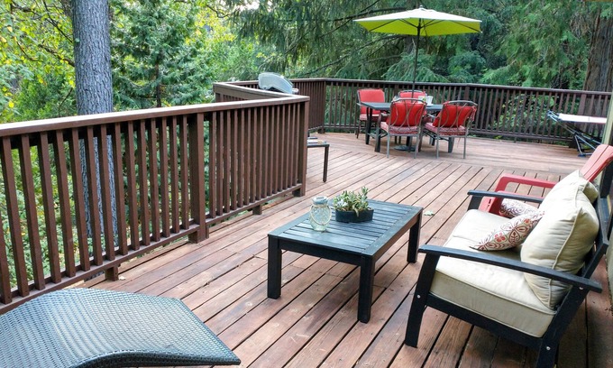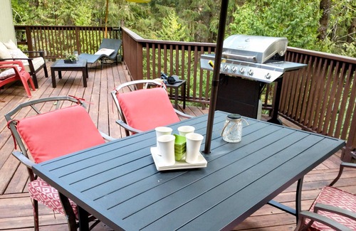 Right in Apple Hill, the Adventure Cabin is the perfect place for family and friends to gather and make memories. The wrap around deck is the place to relax, sip wine and watch wildlife and nature. Upstairs kitchen has french doors which open up to the spacious deck that feels as if you are in a tree house. The whimsical 2 bedrooms upstairs share a unique bathroom with antique tub and sink from a famous hotel in San Francisco. Downstairs is the place for kids to hang out with a common room complete with double bed with a twin trundle, TV and complete bathroom. An office space adjacent has books, games, craft supplies, puzzels, and more for family fun. Weddings, wine tasting, agriculture tours, Apple pie, hiking, rafting and many more adventures are close by to explore and discover.