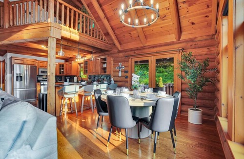 The spacious main floor features an open floor plan with a cozy living room, with a wood burning fire place, dining area with seating for 10, coffee bar, and fully equipped kitchen. On this floor, you will also find two bedrooms each with a king bed, and a shared full bathroom. Double doors off the dining area, lead to a back, covered porch, with additional dining for 6 people. There is where you will also find the 7-8 person hot tub, and fire pit area with seating for 6, and firewood provided. Upstairs you will find a cozy sitting area in the loft that overlooks the living area, and with a majestic view out the large windows. You will also find the luxury master suite, with a full private bath, futon, and an additional area attached with a twin bed, perfect for a small child. Downstairs, you will find another cozy living space with a large sectional sofa, TV, electronic gaming table, and a small play area equipped with toys, books, and games for the little ones in your group. There is also, one large bedroom with a luxury king bed, and two full-size bunk beds. There is a laundry area with a washer and dryer, and one full bathroom, with a bath tub, ensuring everyone`s comfort. In the detached garage you will find a gaming area equipped with Ping-Pong, and the driveway has a Pickleball Court. All game equipment is provided.