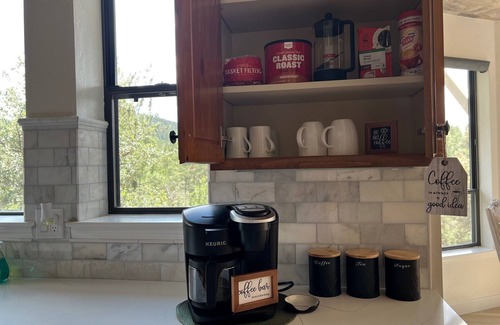 Fully stocked kitchen with panoramic views of the pines, so you never have to leave! Evenings with a glass of wine in the hot tub and star gazing is our favorite thing to do.