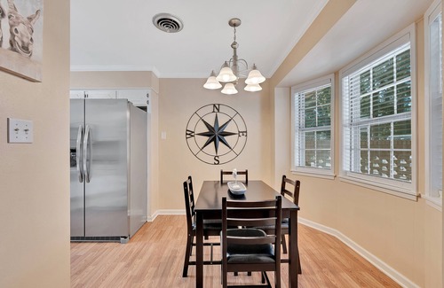 ➺ The dining area offers seating for 4, bathed in the warm glow of a chandelier.