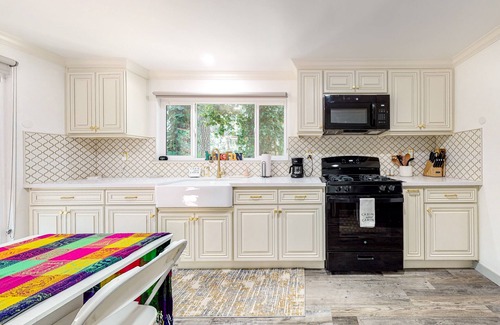 Boasting rustic charm, the updated interior comes well appointed with all the modern comforts of home. Showcases a gorgeous backsplash and new cabinet and counter finishes, the kitchen comes equipped with all the major appliances, cookware, and utensils you'll need for easy at-home meal planning. A deep-basin farmhouse sink will make cleanup a breeze. In the evenings, cozy up by the wood stove in the living room for game and movie nights - a smart TV and collection of board games provide family-friendly entertainment. The private washer and dryer will let you pack light while planning occasion and additional home perks include free high-speed WiFi.