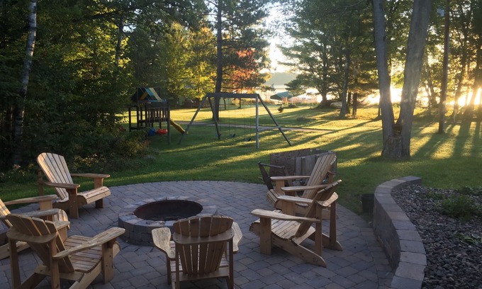 The air-conditioned lodge sits on 290 acre Nicaboyne Lake, which is a fun, fully recreational lake between 10am-5pm. The area feels more peaceful than some of the other lakes in the area as the east side of the lake is undeveloped. When you look out to the lake from the lodge and beach it somewhat resembles the boundary waters. The lodge is set back from neighboring cabins, which were originally part of the resort, and is nestled in the woods, offering privacy. Its expansive front lawn is perfect for yard games like softball, kickball, tug of war, etc. The yard also has a shuffleboard and a horseshoe pit. Kids love the large play set, too!