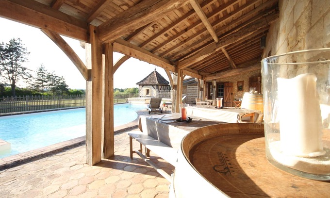 Between Bordeaux (Saint-Émilion), Sarlat (les Eyzies, Lascaux), 13 miles away from Bergerac. Former wine warehouse dating back from the 18th century, one storey-level, golden stones, exposed beams, large volumes and a lot of charm. Large West facing terrace with awning on the swimming pool (14x7m with paddling pool and secure with "Turtle" type alarm) to enjoy the free view and the rural setting. Teak deckchairs, gas Plancha (60x40 cm), garden furniture. Equipped open plan kitchen overlooking the living area with authentic fireplace and pressing shed. Comfort in the 3 double bedrooms; direct independent access to the outdoors area, 2 have access to the pool with WC and bathroom. Children mezzanine bedroom (4 beds) with shower room. This former wine warehouse was perfectly converted for your family meetings, birthdays, cousin reunions, communions and holidays with friends. Tranquillity and privacy for "relaxing breaks" on a 705 acre park. Welcome to a quality stay!