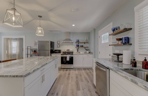 This home is so close to Ft Jackson you can hear the daily bugle calls! Recently renovated from top to bottom, the house has an expanded open concept living area + a den and dining area three steps down from the main level and entry. Three queen bedrooms and two bathrooms including a private main suite & bath round out the sleeping areas. The back yard is shady and has a patio with outdoor dining and seating furniture. Stores, groceries and dining are also nearby, and Ft Jackson too of course!