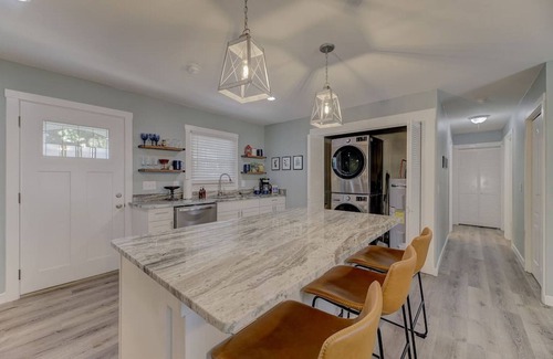 There is a queen size main bedroom with closet, dresser, bedside tables and a private bathroom with stand-up shower, all completely brand new and stylish. The hall bathroom is also brand new and has a tub/shower combo and clean modern style. The second queen size bedroom is spacious with a dresser, closet, bedside tables and room darkening shades. The third bedroom is on the smaller side with a queen size bed, nightstand, closet and luggage rack.