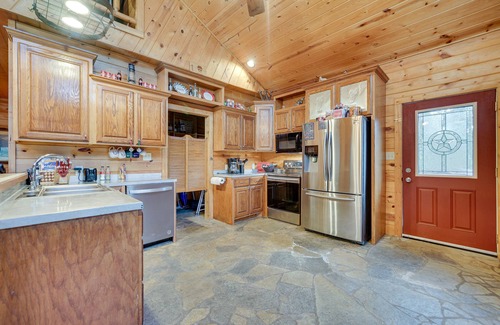 Book a peaceful escape at this Fort Towson vacation rental. Boasting wooded surroundings and a spacious deck, this 5-bed, 2.5-bath cabin is perfect for enjoying the great outdoors. Spend your days boating on Raymond Gary Lake or visiting the Fort Towson Historic Site. Return home to dine al fresco on the deck and cozy up by the indoor fireplace!