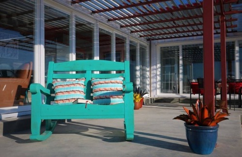The Chisos House is an ultra-modern home built from two recycled shipping containers, one forty feet long and one twenty feet long. They are joined together at a 90° angle around a large, shaded patio. The forty contains the living room, dining area, and kitchen. The twenty contains the bathroom and bedroom. Modern design, styling, and art are featured inside and out. Please view the photos for the best description.