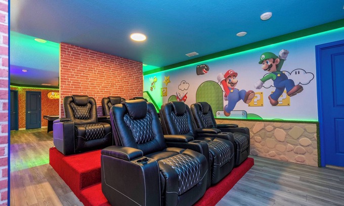 Entertainment: private movie theater, air hockey, game console, and multiple TVs.