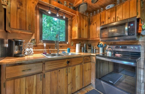 North Georgia Cabin that sleeps 4 atop mountain. The Fox Den Cabin is a charming mountain cabin that sleeps four. Outside you’ll find a partially covered wrap-around porch with a hot tub, propane grill, rocking chairs, swing, and clean country air. Once you enter through the front door, you are greeted with a high ceiling and open floor plan. The living room has a very comfortable automatic reclining couch, large flat screen TV, antique wood burning stove, DVD’s and player, Nintendo mini, Super Nintendo mini, board games, and cards. Attached to the living room is the perfect modern kitchen, equipped with stainless-steel appliances, several pots and pans, and basic kitchen essentials. As you head past the kitchen, you’ll find the bathroom with a shower/tub combo on the left. On the right you’ll find the master bedroom with a queen size bed. As you exit the master bedroom, be sure to look for the fox face which is naturally formed in the wooden floor.