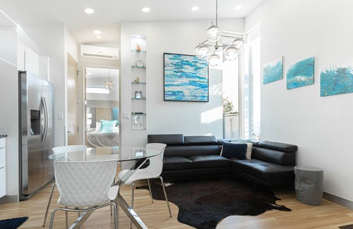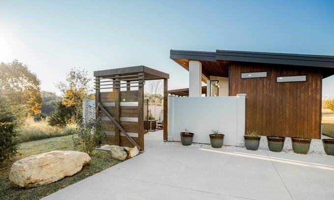 Private Couple's Retreat! Relax in your own quiet courtyard with waterfall, hot tub, outdoor dining and grilling entertainment space! The house is cozy, luxurious and modern, perfect for couples who want a refreshing getaway. Enjoy a rainfall shower experience in the spacious European style shower. Full Sized washer and dryer, linens, and kitchen necessities are provided. Complimentary bottled water and Keurig coffee and hot chocolate provided. Wifi is through StarLink and works good.