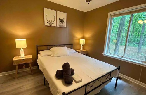 Fox Hollow boasts an array of amenities designed to ensure your comfort and enjoyment during your stay. The property comfortably sleeps up to eight guests, featuring one king-size bed, two queen-size beds, and an air mattress. Enjoy two modern bathrooms and a fully equipped kitchen where you can prepare meals or cater your wedding festivities. The expansive living room is perfect for gathering with loved ones, while the large deck offers delightful outdoor seating to soak in the peaceful atmosphere. Take advantage of the two kayaks provided for a serene afternoon on the lake, just a short walk from your doorstep.