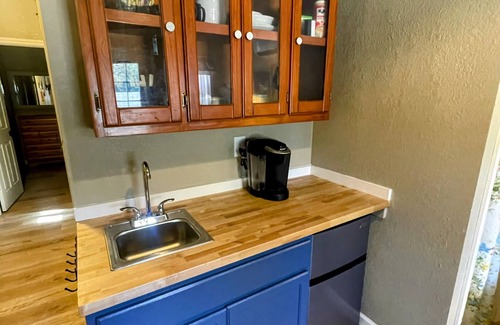 The Fox Kit Cabin is a 1br/1ba tiny home in approximately 400 sq/ft. A quiet solitude for a solo traveler or a cozy nest for a couple the cabin is very much like an extended stay hotel room in a free standing house. There is a covered porch at the entry where you can wake to fresh air and coffee. Inside the living area, dining area, and kitchenette are all one super functional space where you can relax in one of the comfy chairs and watch tv or nibble breakfast at the vintage cafe table. You won't be cooking three-course meals but the kitchenette has a small fridge/freezer, sink, microwave, coffee maker, and kitchen ware.
