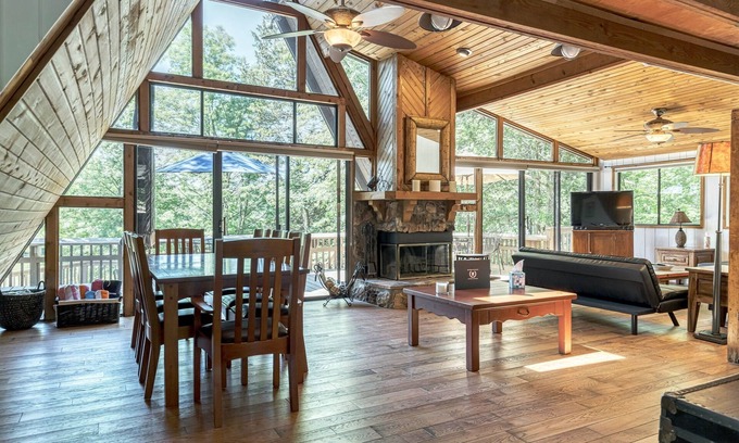 Inside, the home features an updated kitchen and dining area that opens into a spacious great room with soaring A-frame windows, filling the space with natural light and framing serene lake views. A cozy wood-burning fireplace creates the perfect ambiance for cool evenings.