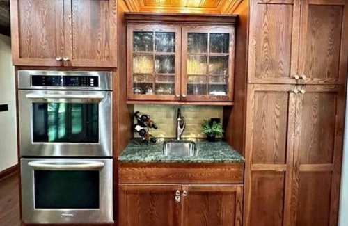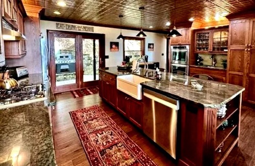 Foxwood has a gourmet kitchen with a stamped copper ceiling, farmhouse sink, wet bar, granite countertops, gas cooktop and double electric ovens. Our refrigerator will be stocked with bottled water, your choice of soft drinks and adult beverages when you arrive. A waffle maker, 2 coffee makers, blender, plenty of wine glasses, microwave oven and crock pot round out this well equipped kitchen.