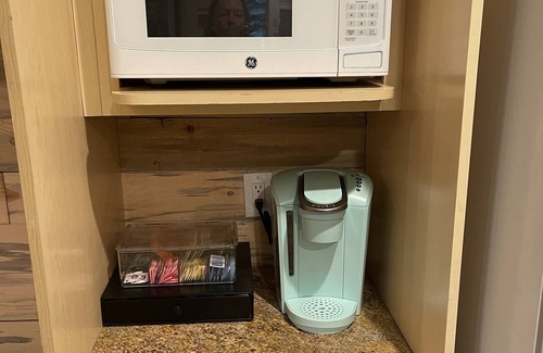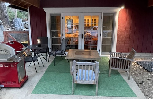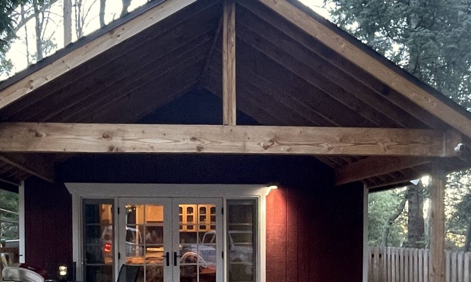 This roomy studio has a king size bed, fully stocked kitchen, two reclining chairs, small dining table, Full bathroom with small shower, Loft with queen bed - There is not much standing Height in the loft. It is mainly for using the bed. The outside patio area is surrounded by the forest. Enjoy the BBQ and Fire pit fueled by propane.