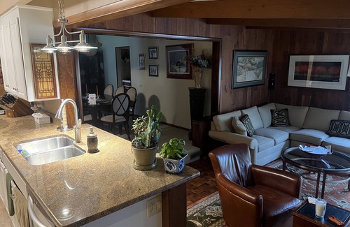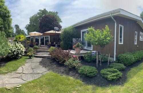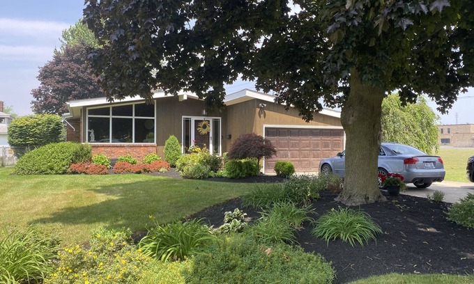 Beautiful 50+ year old Frank Lloyd Wright inspired 3 bedroom, 3 full bath ranch home on half acre property. Has all the amenities: fully equipped kitchen with 2 ovens; natural gas insert brick fireplace in redwood beamed LR and dining room; baby grand piano; dining room table that comfortably seats 12; family room with 65” Samsung QLED TV and full wet bar; each BR has queen bed, full closet, dresser and TV; seasonally fully furnished back deck with natural gas grill; solid wood doors; central ac; secure wi-fi; security system and more. WINTER VISITORS… we have a natural gas generator that runs the entire house for as long as is needed if the power ever goes out!! AND we’re less than 30 minutes from great local ski areas! Great for everything from a family vacation to beautiful WNY to an NFL football weekend. Located in the heart of Hamburg NY, this home is easy walking distance to the center of the Village of Hamburg, minutes from Lake Erie, only 3 miles to Buffalo Bills Highmark Stadium, less than 10 miles from Downtown Buffalo and only 33 mi. from one of the “Seven Wonders of the World” Niagara Falls! A warm, comfortable mid-century modern home you won’t want to leave!