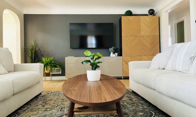 Upon entering, you are greeted by an open-concept living space adorned with high-end finishes and minimalist decor. The living room features a cozy yet stylish setup with a large flat-screen TV and seating for 8, perfect for relaxing after a day exploring the local attractions.