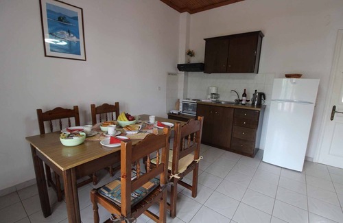 Frankis apartments are in a large plot of land with blooming gardens, fruit and olive trees .Its swimming pool area is free for customers ,while if they like they can have breakfast or drinks and coffee made and served by their hosts with an extra charge.