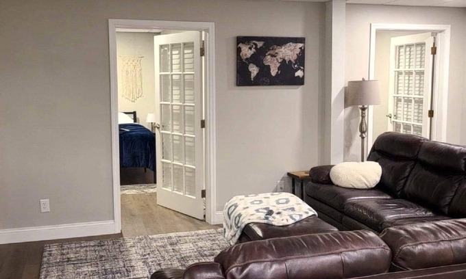 Welcome to our spacious 1300 Sq Ft 2 bedroom 1 bath apartment on Historic Franklin St. Franklin is well known for its abundance of entertainment, fantastic food, ice cream shop, boutiques, and much more. All within walking distance from the apartment. The apartment was 100% remolded down to the studs specifically to be a short term rental. Enjoy the 55in flat screen smart tv in the living room on the cozy leather couch. Each bedroom has a king bed as well as a wall mounted tv. The kitchen has been tastefully done with butcher block floating shelves as well as countertops. The bathroom has a lovely tiled shower and the laundry room has a washer and dryer.