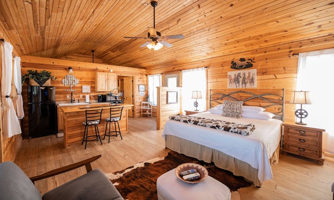 As you step inside your cabin, you will appreciate the comfortable king size bed with elegant hill country style bedding. The bedroom/sitting area includes a flat screen TV with satellite selections and comfortable seating for relaxing. The main area also includes a kitchenette complete with a convection oven, full size refrigerator, keurig and microwave plus an island bar with bar stools. Adjoining this large room is the huge bathroom with tub/shower combo.