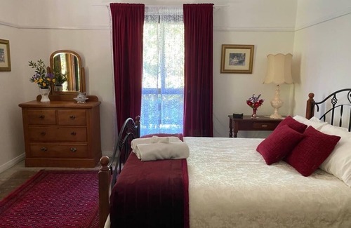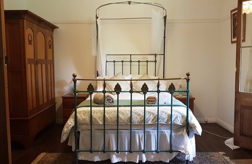 The house has an old world feel, full of period features, high ceilings and original old floors. The four double size bedrooms have french doors which open out onto big wrap-around verandahs. The wood fire in the lounge room and the claws foot bath which looks out to the trees and local mountain ranges, are both very popular with guests.