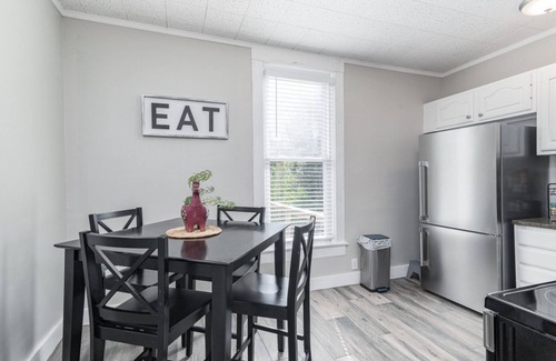 Welcome to The Benjamin! This 100 year old home has been completely remodeled for your comfort. The back deck is furnished with comfortable seating and a fire box for for making memories.