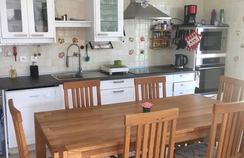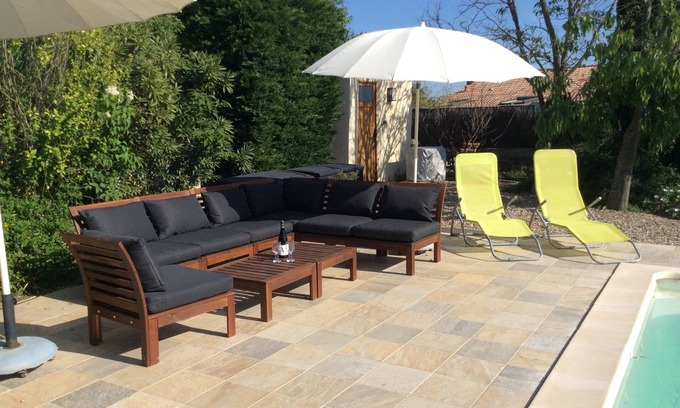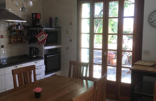 Maison Agnes is situated 5 minutes' walk from the centre of the medieval village of Laurens in the wine district of Faugeres. It is a one storey villa in a secluded Mediterranean garden with a private pool 10x4m. UK satellite TV and French channels, DVD player and free internet access. The villa has 3 AC units.The beautiful French windows lead out to the garden where you can dine and find shade under the mulberry trees and the barbecue (gas-heated) is close to the dining area. You can also have a game of Table Tennis in a shaded area. The garden is surrounded by hedges and the sun shines on the pool area the whole day. Here you can also find a pool shower, 8 sun chairs and a group of sofa and armchairs and a table for a cold drink or a cup of coffee. In the front garden there are several fruit trees, like pear, fig, pomegranate, quince and clementine and you are allowed to pick them when they are ripe. There is parking space for several cars in the garden and a car port.