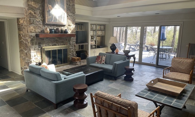 Our newly installed ultraviolet HVAC air filtration system provides added protection inside. And outside, you will immediately notice the fresh clean natural air breezes and lots of outdoor space. This is the stress-free vacation get-away you need. Walk the hills and roads of Eden Isle or simply relax on the deck. This architecturally designed house sits on top of Eden Isle on a lush private lot where you can watch the birds, fox, and deer while sipping your morning Joe or evening cocktail. Early morning walks rate a 10! The property side yard is suitable for bocci ball and volley ball (fun!). Three bedrooms are perfect for two couples and four kids. One king room has an en suite bath. A golf cart is available upon request for easy access to all the Eden Isle amenities. It’s the preferred mode of travel around Eden Isle. The large deck with fire table and gas grill are perfect for after-the-lake cookouts.