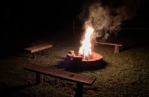 The house sits on six acres. The yard is shared with camping spots for tents and small RVs and a communal fire pit about 75 feet from the house.