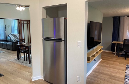 As you enter through the back door, you’ll step into the cozy family room. Here, you’ll find a 65" Roku TV, perfect for unwinding after a day of exploring. You’re welcome to log into your own streaming services or enjoy movies and live TV through the RokuTV or FreeVee apps. The room also features a convenient sit/stand desk positioned in front of a large window, ideal for those needing to catch up on work. For added privacy or to reduce screen glare, simply close the blackout curtains. We’ve also provided a basketball and a bocce set for your entertainment.
