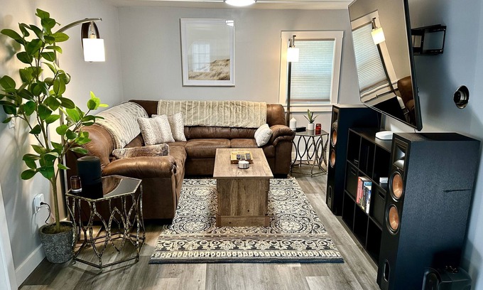 This 1000ft² apartment has been thoroughly renovated and thoughtfully furnished with everything you need to feel at home (and then some). The kitchen is ready to go with ample cabinet space, butcher block countertops, stainless steel appliances (including a dishwasher!), and all the kitchen essentials we could think of. In the main bathroom you'll find a 48" shower with a 10" rainfall shower head and matching handheld sprayer, as well as an ultra-large capacity smart washer/dryer set. The living room is fully decked out with a microfiber leather sectional, lift-top coffee table, 75" 4K Samsung TV, Roku 4K Streaming, and huge Klipsch tower speakers. Upstairs you'll find the master bedroom, complete with its own half bath, small walk-in closet, and office nook. The second bedroom has all the essentials including a 6-drawer bureau and full-size desk. The upstairs common area has a futon for even more sleeping options. Centrally located in Augusta - A stone's throw from Water Street where you'll find Mill Park and lots of shops, bars and restaurants along the Kennebec River. A short drive from the Marketplace at Augusta, the Capitol Building, and the Augusta Airport. Less than a 20 minute drive from both the Belgrade and Winthrop Lakes Regions.