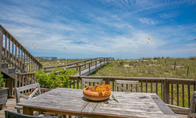 This beach condo is truly one of a kind. Unlike most condos, there are no stairs or elevators along your route to get to the beach. Just walk out the back door, and you're there! Another favorite feature of ours is the large deck out back. Where most people have a balcony with a couple of chairs, our beachfront deck is large enough to house an outdoor sectional, two large lounge chairs with an ottoman, a teak table that seats six, a hammock, and 3 raised garden beds. You won't want to spend any time inside!!