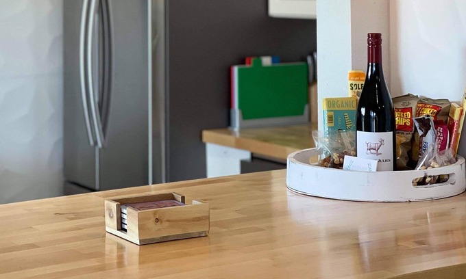 This unit has a private entrance, a real wood burning fireplace, ample storage and is fully furnished with new contemporary furniture including a fully stocked kitchen furnished with a new high end Samsung induction cooktop, high end Samsung stove, high end Samsung microwave, high end Samsung refrigerator, dishwasher, and a full-sized washer/dryer. The countertops throughout the apartment are high end butcher block finished with a completely natural food safe finish.