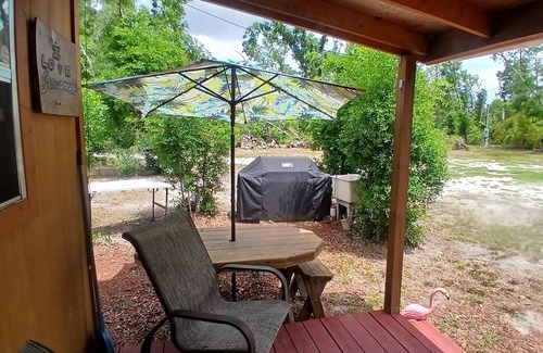 An awesome stay whether you're passing through or looking for a nice quiet place to recharge while star gazing listening to the Owls preform an unforgettable musical of callings of nature while being accompanied by ther special guests that No surround sound or recording could ever duplicate resting on a private 10 wooded acers of land this cozy tiny home. The 1-bedroom full size bed 1-bath tiled shower with kitchenette retreat offers WiFi, AC,and heat for your comfort front porch outside kitchen including webber gas grill,stove picnic table outdoor seating including a fire pit. traveling in Mayo don't forget to visit. Not to mention the Suwannee River Simms landing boat ramp and swimming is one mile from this property along with Blue Springs Anderson Springs,Royal springs live oak spirit of the Suwannee music park, Perry, Maddison,Kayaks available on request . Enjoy the evening sky full of stars while the owls preform a spectacular ocaplelo. Looking forward to hosting you.Your host Stacey...