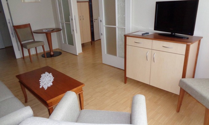 Our friendly 2-room apartment with 40 sqm offers space for two people and is located in the center of the attractive spa town of Bad Sassendorf, only a few steps away from the pretty town center with a neat half-timbered atmosphere and in the immediate vicinity of the spa park. The non-smoking apartment is bright and comfortably furnished with a combined living room and bedroom with parquet floors and has a comfortable double bed. The integrated kitchenette also offers a coffee machine and a kettle. The barrier-free bathroom is equipped with a shower and toilet. There is also a telephone and satellite TV as well as an emergency bell. The apartment is allergy-friendly.