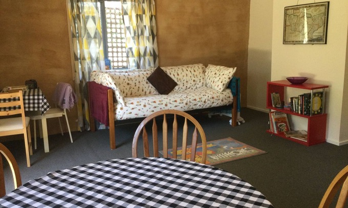Guests enjoy comfortable winter and summer holidays in owner built local strawbale and earthen render cottages in a 5-acre native setting. The cottages are based on 'small footprint principles' using solar power for energy needs - water heating & pump, light, ceiling fans throughout, room heaters cooking etc and passive energy principles eg north facing aspect with rock/earth bank to the rear, thermal insulating building materials, roof & floor insulation, double glazing all windows, wood burning heaters in the larger cottages.