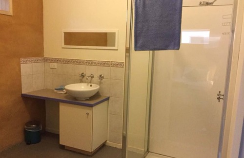 Our BLUE Studio cottage No. 2, sleeps 2 in 2 bedrooms - Bedr.1 with a Queen bed : Bed. 2 with Trilogy bunk beds: Double bed below, Single bed above; Bathroom has a spacious 'Walk in' shower with safety chair and solid glass brick privacy screen, Vanity unit, and hand basin; Separate wheelchair friendly toilet central to all rooms; Open plan lounge dining area, with wood burning heater for winter and cool nights: full length sliding doors out to north facing deck overlooking 5 acres of native garden & dam. The triple earth rendered thick walls, 5 star ceiling / shared wall insulation, north facing prospect and double glazed windows maximise heating and cooling for all seasons, plus floor & ceiling fans / generous supply of extra doonas, throws and hot water bottles for those extreme weather days. Compare these features with our AQUA family cottage No. 3.