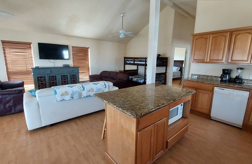 Fully furnished kitchens with beautiful granite counters, extra-long breakfast bar with stools & open to dining/ living areas. Great house for entertaining with large dining table. Covered deck overlooking the Gulf of Mexico with 2 picnic tables & plenty of Adirondack chairs to relax. Deck has a gate at the top of the stairs.