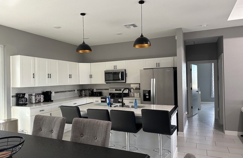 The Living Room has a 75” Samsung Smart TV, with DISH Network satellite TV service and 3.1 Polk surround sound system. Bluetooth speakers allow you to connect your own phone / media devices to listen to music when you are not watching TV. The Fireplace media center provides a romantic setting when the flames are turned on or supply heat on those chilly Florida nights. The power recliner has a built-in USB to power up your devices, two cup holders to hold your favorite beverage, and push buttons to put your feet up. Lie on the modern sectional and push the ottoman in close for instant snuggle time.