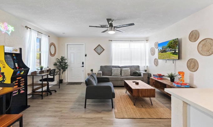 Level up your group getaway at our private 3-home FTL compound-now sleeping up to 10 guests! Perfect for large families, this unique property features a main house with a retro arcade (Pac-Man & Street Fighter) and a full kitchen. Two separate studio suites provide extra space and privacy for your crew. You’re just a short walk to local shops and a quick 5-minute drive to the beach. Enjoy the perfect blend of shared fun and private relaxation in a prime location. Your ultimate FTL refuge awaits!