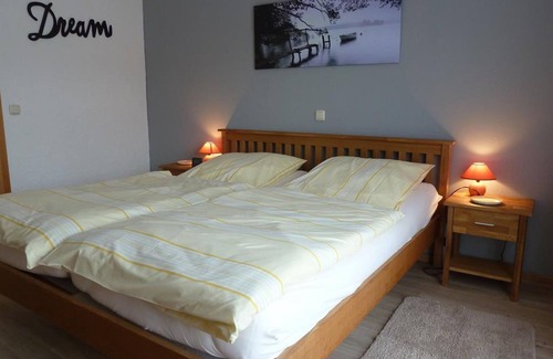 Directly on the lakeshore of the Rursees is our approximately 200 m² 12 person holiday home. In April 2018 again honored with DTV4 stars. The whole house is bright and friendly. 6 double rooms, 3 shower rooms with WC + 1 sep. WC. A living room with 3 leather sofas and fireplace. A large, bright kitchen with everything you need, such as. B. XXL refrigerator, sep. Fridge-freezer, dishwasher and a very large dining table. In addition, in the winter of 2018, we purchased an additional induction plate for the existing 4-plate ceramic hob. Of course, with matching, new kettles and pans, so that our guests who like to cook, can live it out even better. A garage for adjusting bicycles, motorcycles, or boats and ample parking is available directly at the house. A boat dock with private access to the lake completes our offer. A nice pedal boat with space for 5 people is located there and can be used free of charge by all our guests. Canoes and kayaks can be rented in the village and docked at our boat dock to set you back at any time. If you want to bring bicycles, or rent locally (including e-bikes) you can include this in our garage, of course, this also applies to motorcycles. The free-use outdoor pool and the pier for the white fleet (Rurseeschiff) can be reached in about 30 minutes walk, always on the lakeshore past. Rurberg offers different cafes, 1 bistro at the lake, 1 snack with ice cream parlor, 1 kiosk with snack bar and grill, 2 hotels with catering. All with their own charm and offer. 5 minutes away by car there are several ways to buy fresh bread every day. In Einruhr and Woffelsbach there are more interesting restaurants and cafes you can reach by boat, car, or even on foot. There is also a breakfast delivery service. Phone: 02473 93782210 By car, in Simmerath, there are numerous supermarkets and beverage stores, discounters, pharmacies, doctors and a hospital. Of course, here again different Resataurants, snack bars, cafes, ice cream parlors and beautiful shops for clothing etc. Do you want to limit yourself not only to the lake and the forests of the National Park? How about a trip to Monschau, Simonskall, Nideggen, Heimbach, Aachen .... various wildlife parks. We have prepared a great information folder, collected brochures and are of course also happy to personally with tips and recommendations. Even before your arrival!