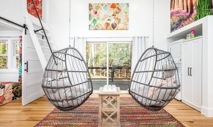 Inside, the treehouse exudes a warm and intimate ambiance, complete with flower-themed decor that brings a touch of blossoming charm to every corner. The king-sized bed invites you to unwind and revel in the peaceful, floral-inspired atmosphere.