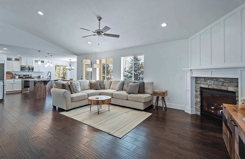 Guests enter the home via the garage entry or the front door where they'll find, located just inside either door, the open-concept living room, kitchen and dining room. The huge windows allow for ample natural light and views into the private yard. There is an 85" SmartTV located in the living room with plenty of lounge space for guests to spread out and enjoy a game with their company. Just off of the living room is the fully-stocked kitchen, featuring gas appliances and a huge walk-in pantry. Guests can enjoy meals at the breakfast countertop bar and also the eight seat dining table. Access to the backyard space is found through the dining room exterior door.