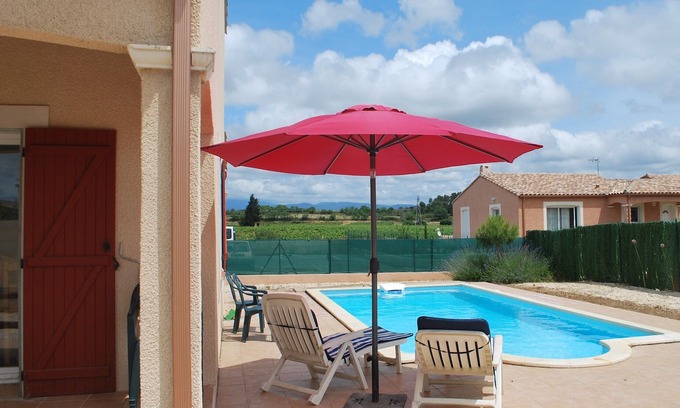 Two-storey modern villa with its own private pool, located in the pretty village of Trebes on the Canal du Midi. A short short walk from the house brings you to the canal-side bars and restaurants at the canal-side in Trebes. Only a ten minute drive from the town of Carcassonne and the Cité heritage site. The house and pool are for your use only. Three bedrooms, large open plan dining/sitting room, well equipped kitchen, bathroom with shower/ bath, and separate second toilet. Suitable for family up to four adults and two children. (Two doubles and one twin room suitable for children). Ample seating and dining areas. TV and free internet access. Patios to front and back for those long Summer evening barbecues. Lovely private pool, outdoor furniture, coal-barbecue, sun-loungers. Short drive to local supermarkets. Excellent location for visiting Carcassonne and beautiful Languedoc countryside.